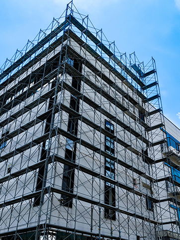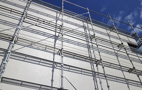 枠組み足場はハンマーを使用しないため、近隣への騒音被害が少ないのもメリット。足場を高く組めるため、大規模修繕によく使われます。