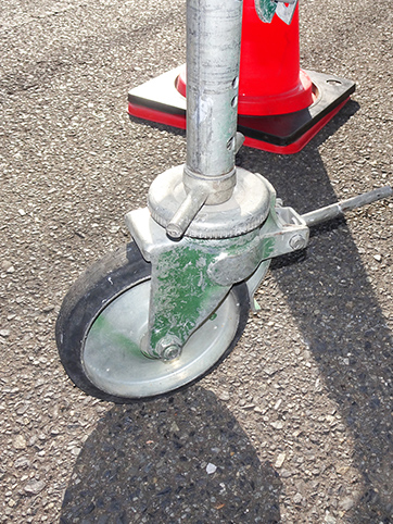 組立てた足場の下部に車輪がついている、移動式足場。臨機応変に移動しやすく、手摺りやはしごなどの防護設備も組み込んでいます。